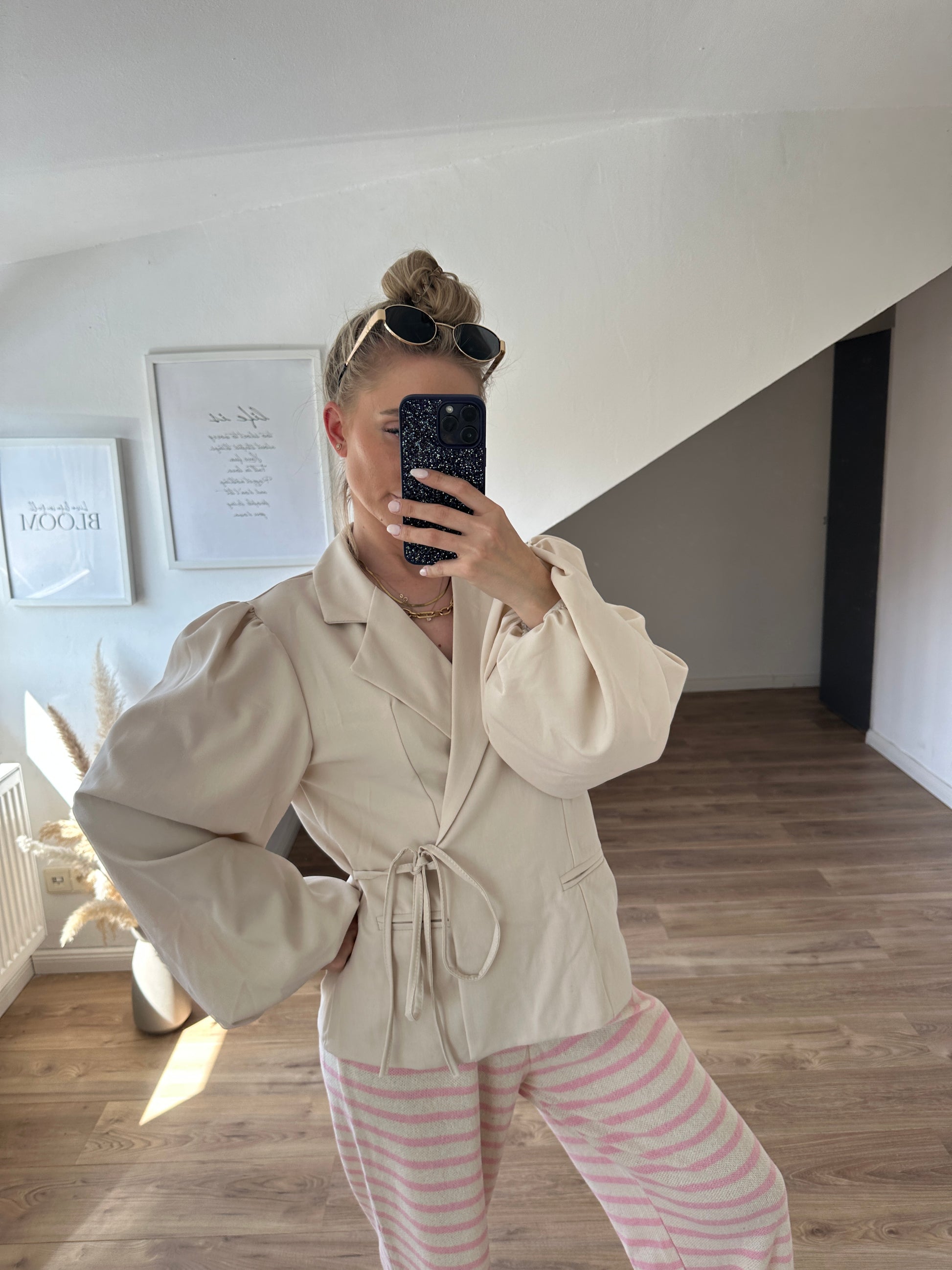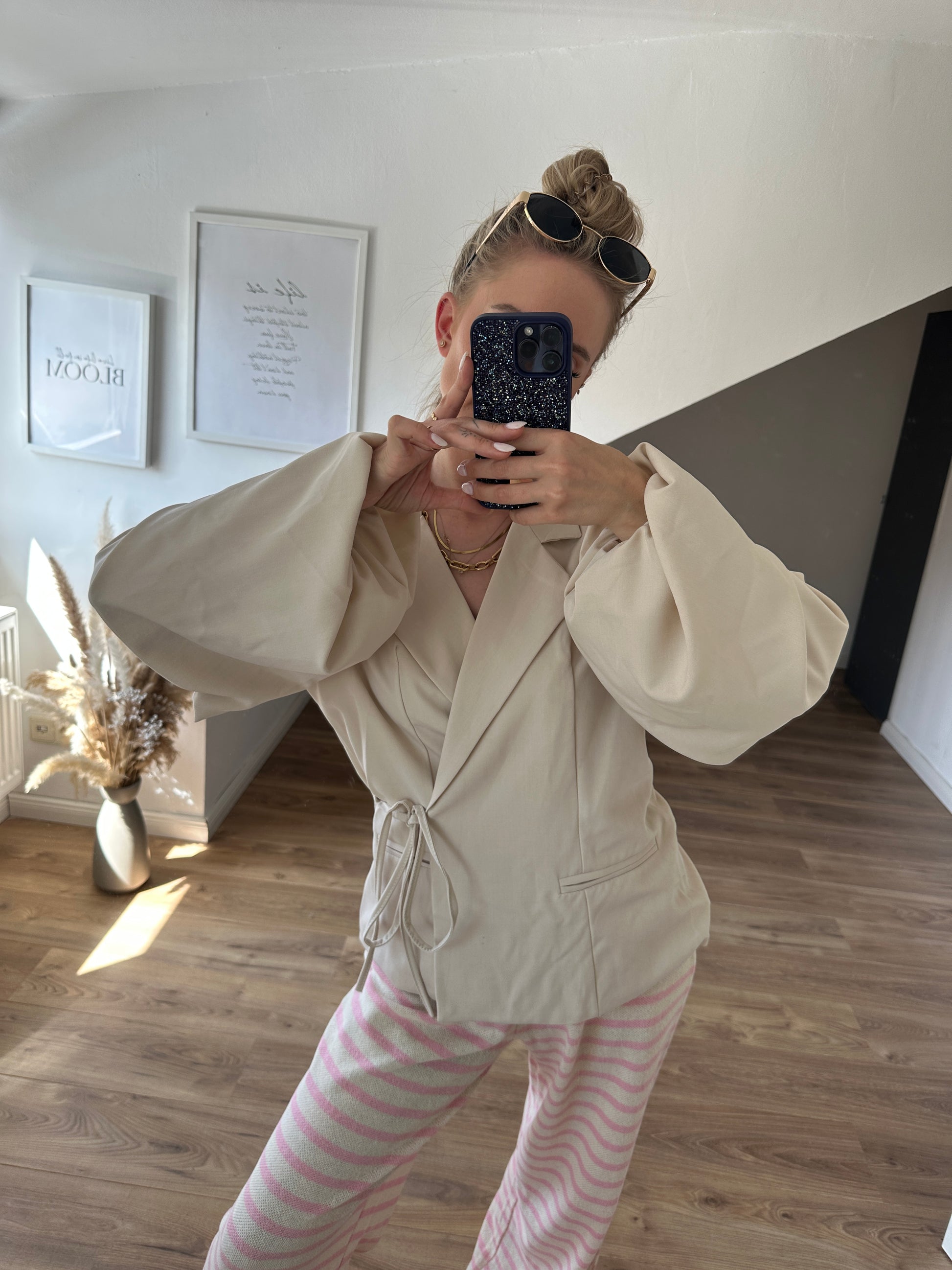 Entdecken Sie unseren stilvollen Blazer, der mit einer charmanten Schleife zum Zubinden versehen ist. Dieser Blazer vereint Eleganz und Komfort und ist das perfekte Kleidungsstück für jede Gelegenheit – sei es im Büro, bei einem Abendessen oder einem besonderen Anlass.