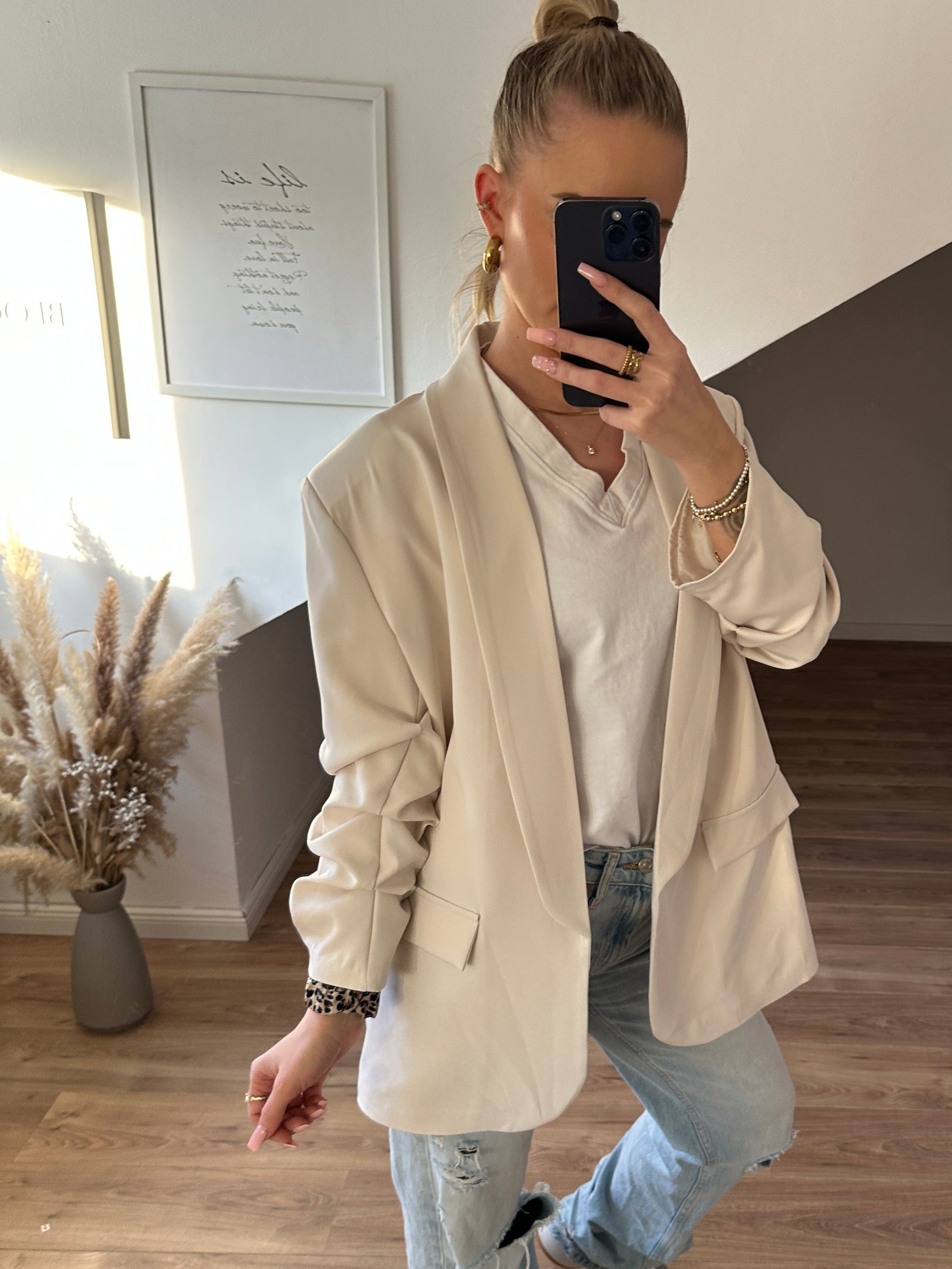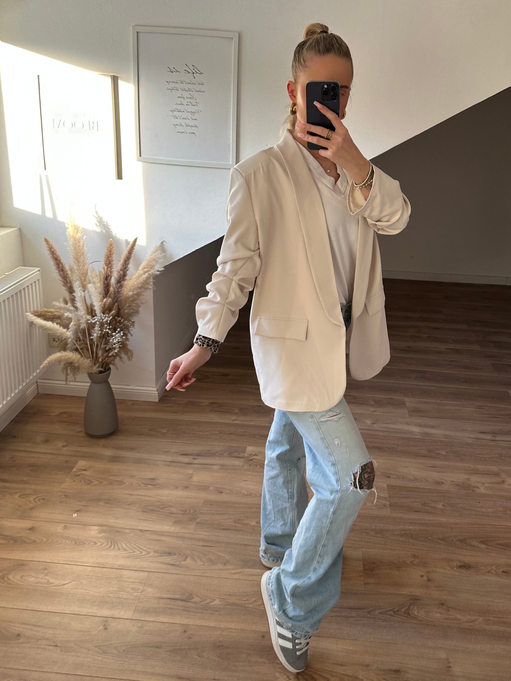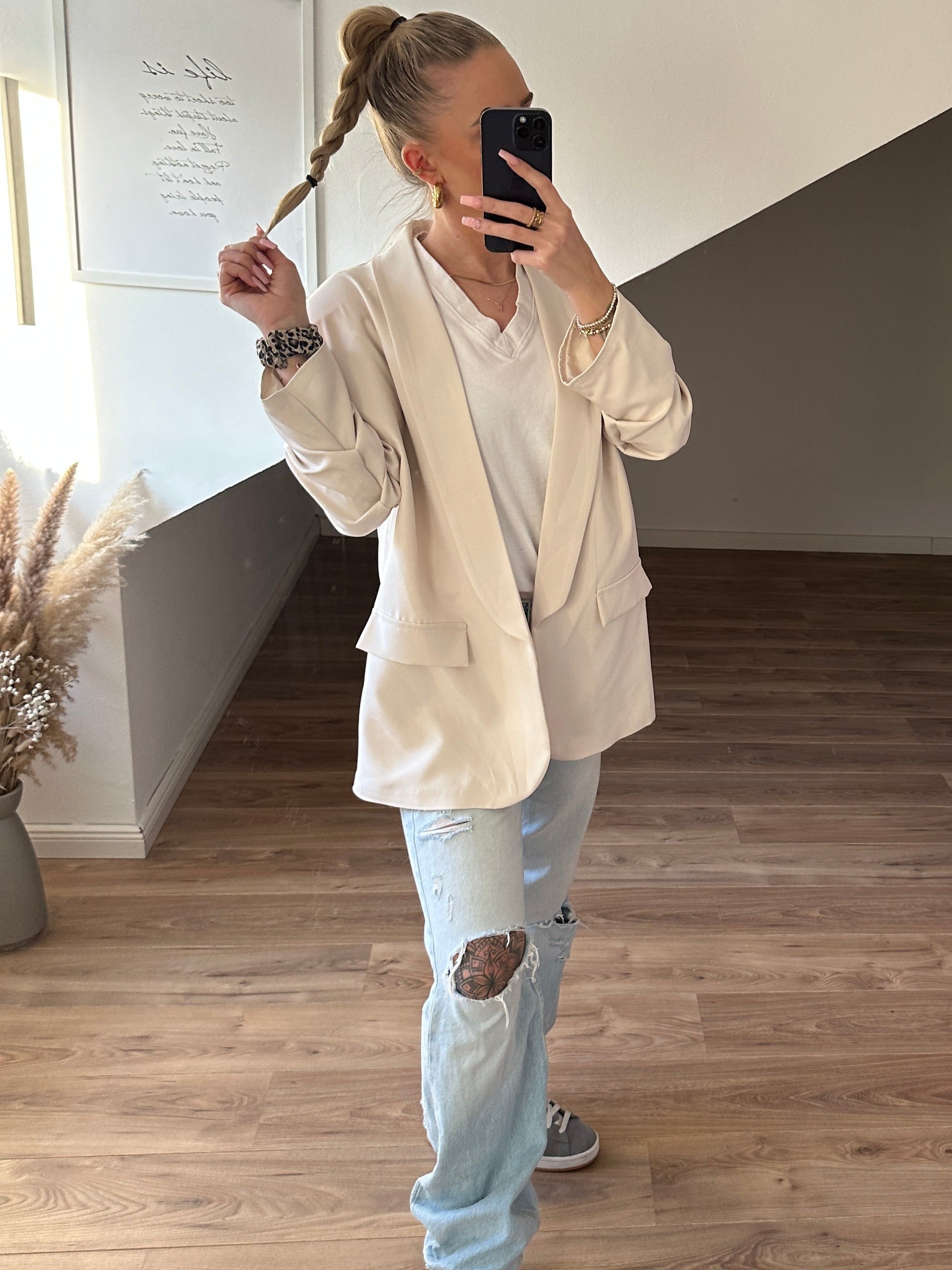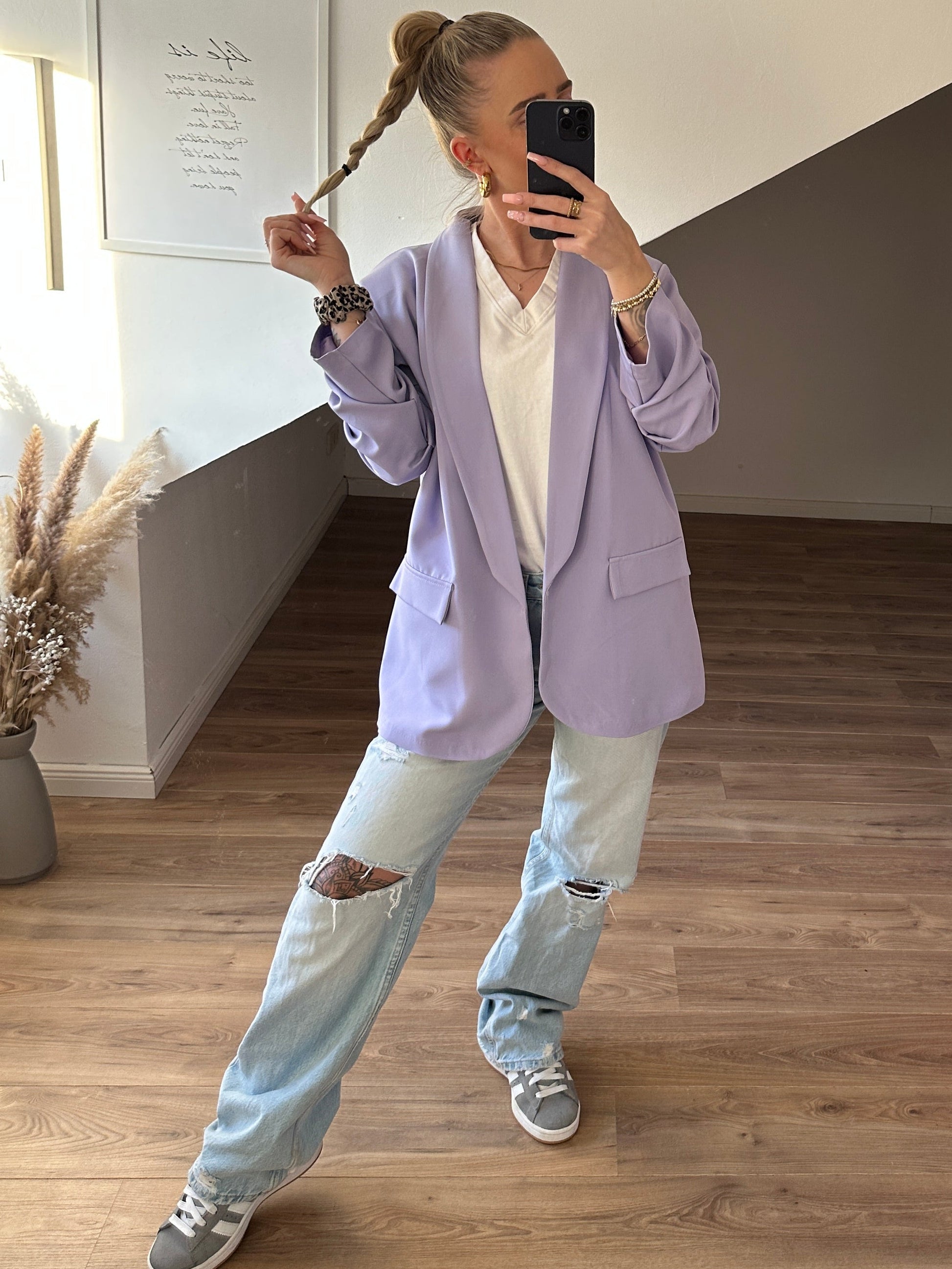 Kombinieren Sie diesen Blazer mit einer Bluse und einer eleganten Hose für einen professionellen Look im Büro. Für einen lässigen Abendlook tragen Sie ihn über einem T-Shirt und Jeans. Der Blazer lässt sich auch hervorragend mit einem Kleid kombinieren, um einen schicken, femininen Stil zu kreieren.
