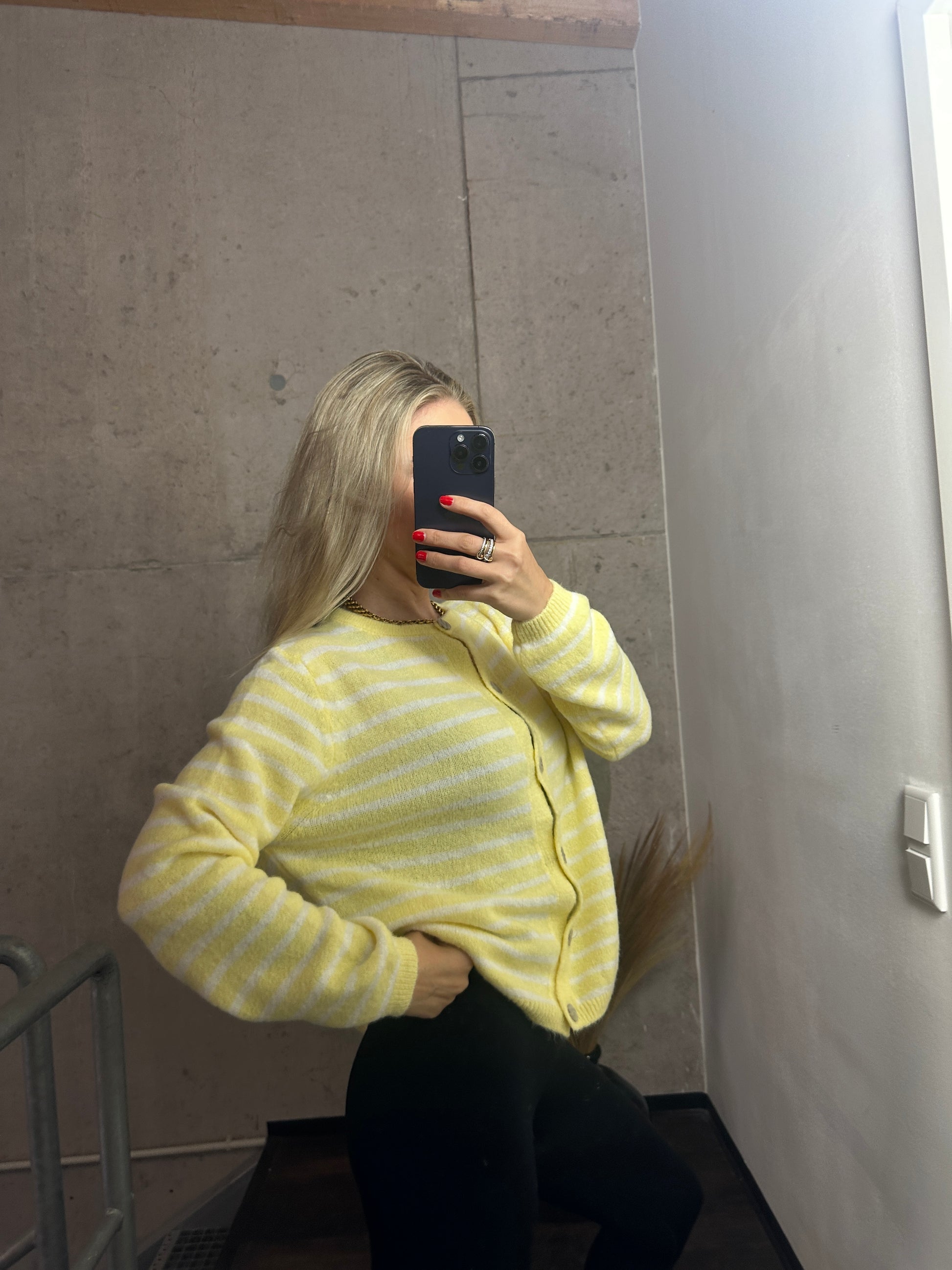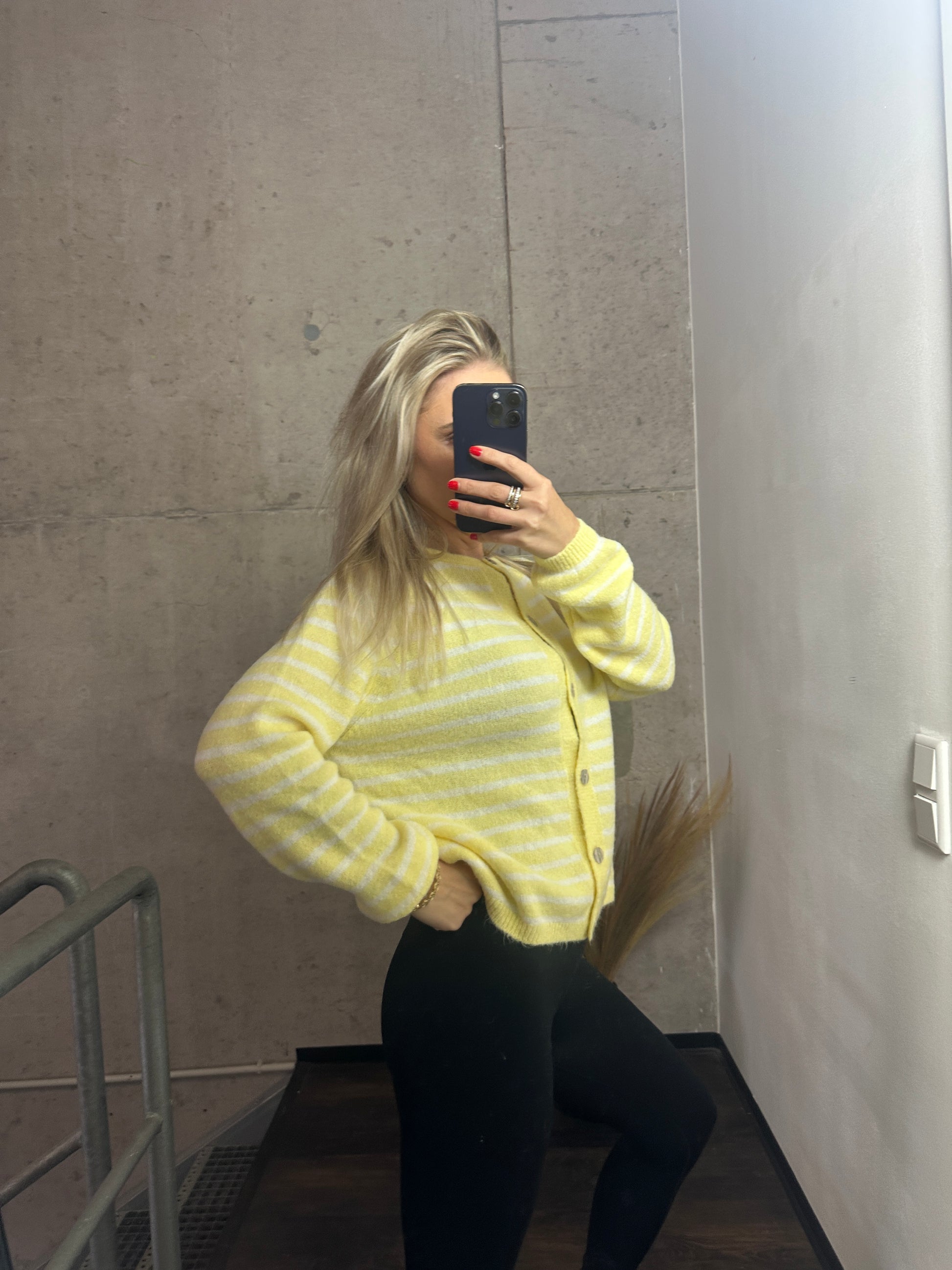 Cardigan Knöpfi Rundhals Gelb Weiß