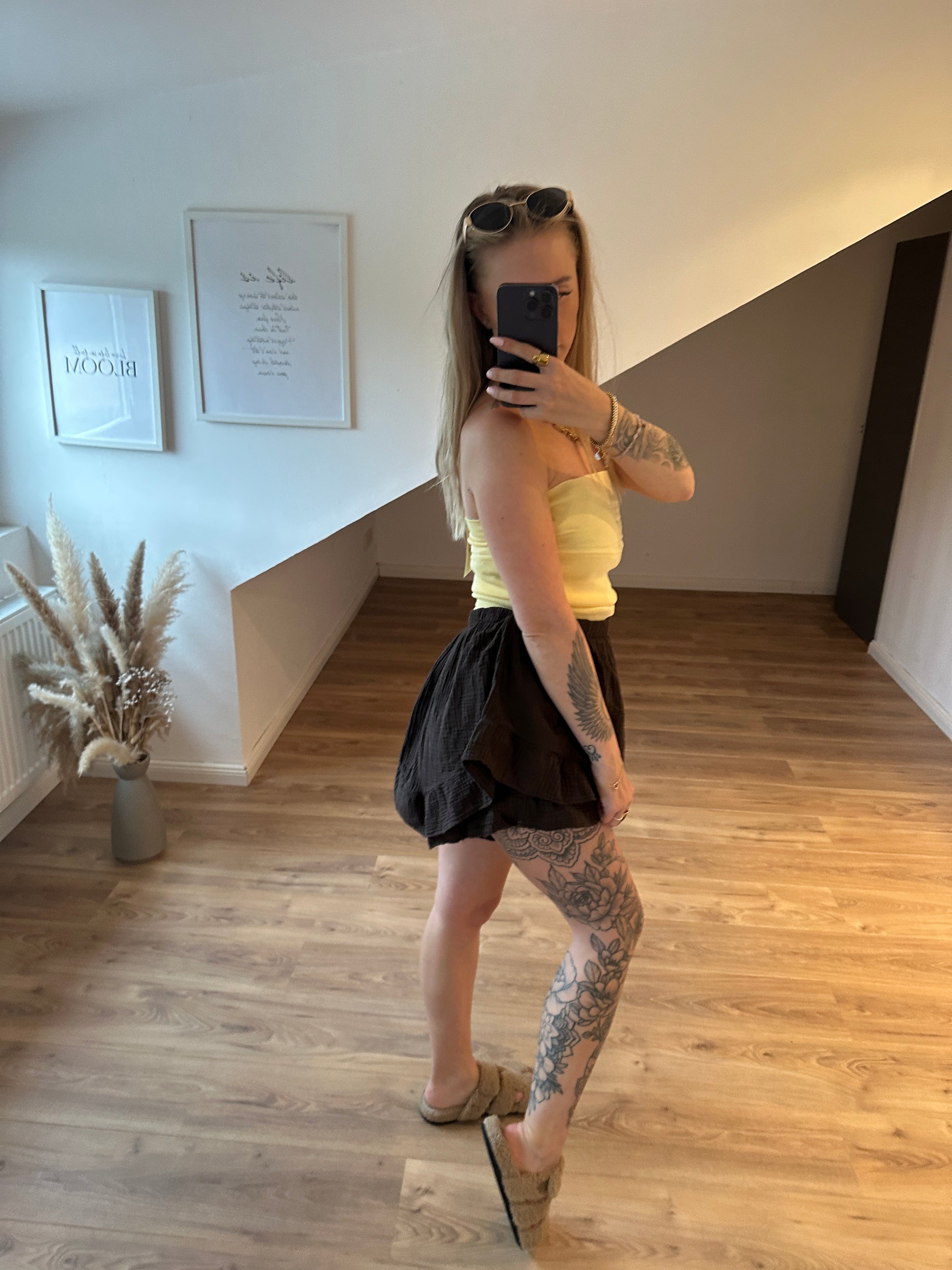 Verleihen Sie Ihrem Outfit einen verspielten Touch mit unserem bezaubernden Musselinhosenrock! Dieser Rock kombiniert den Komfort von Hosen mit dem femininen Flair eines Rocks und ist die perfekte Wahl für einen lässigen, aber dennoch stylischen Look.